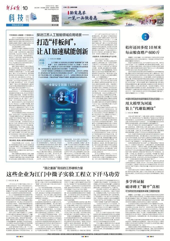2026年1月21日,《新华日报》以《探访江苏人工智能领域应用场景——打造“样板间”, 让AI加速赋能创新》为题,报道了星空电竞等入选江苏省“前沿技术应用场景建设示范名单”企业,在应用场景建设方面的实践与成效。